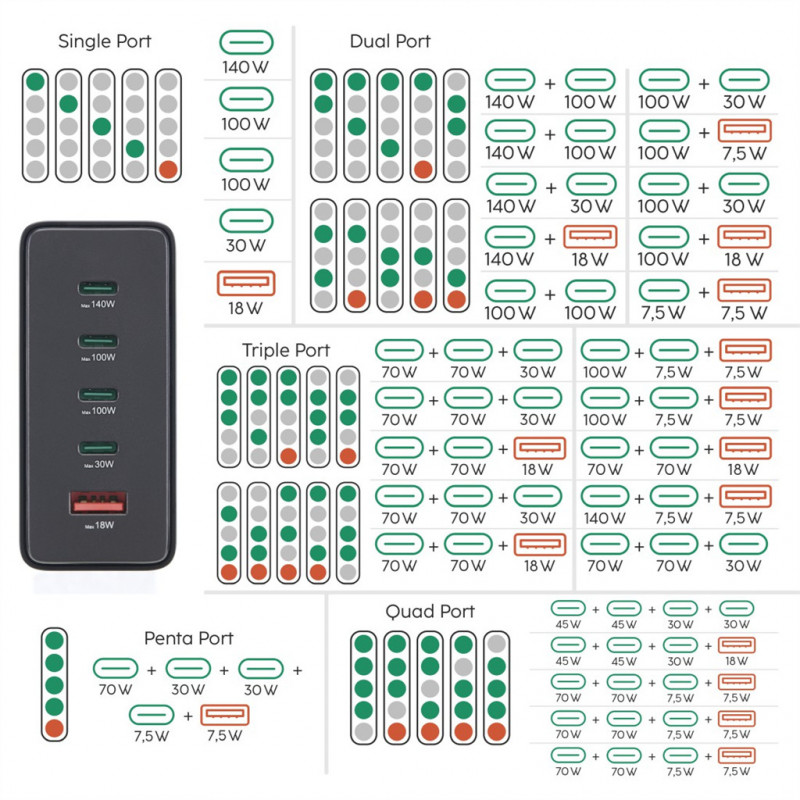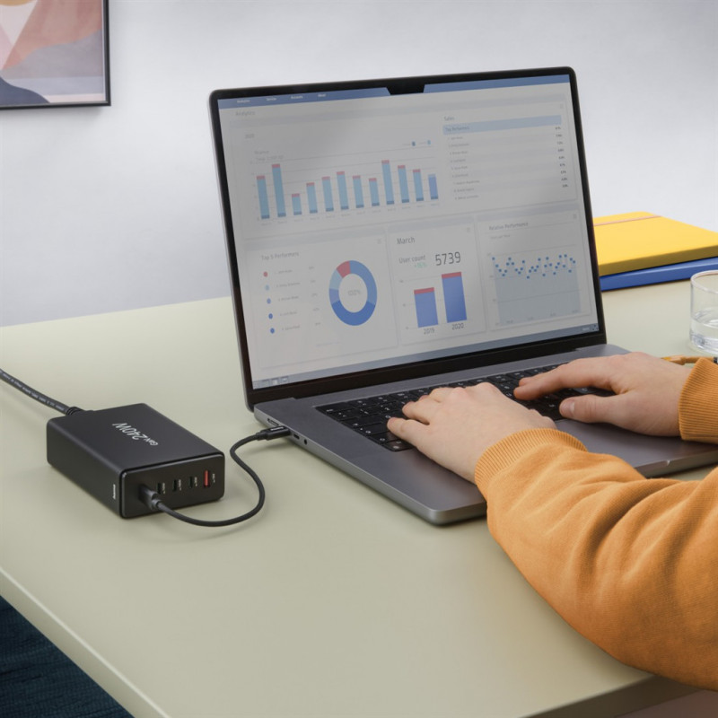- výkon až 140 W pre jedno zariadenie umožňuje nabíjať aj náročné notebooky s napájaním USB PD